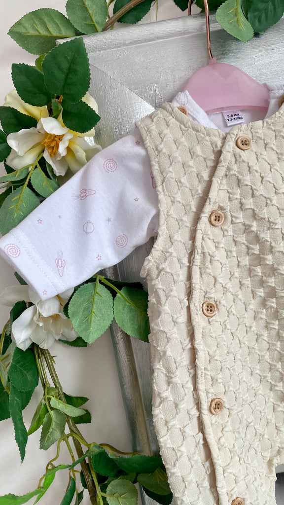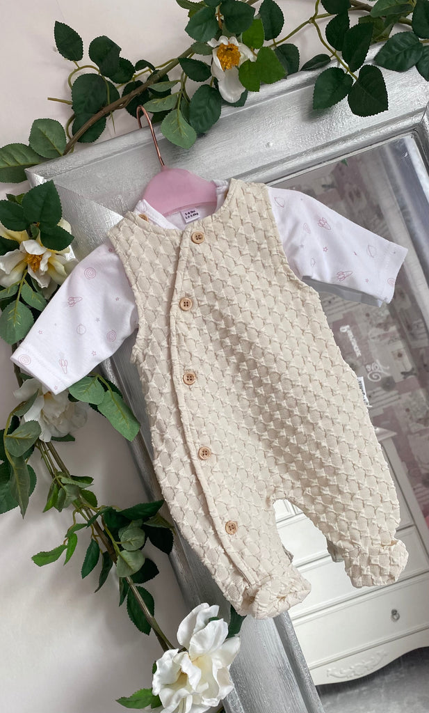 Material: 100% Polyester; Top 65% Polyester, 35% Cotton Colour: Taupe Sizes: NB, 0-3, 3-6, 6-9 Months