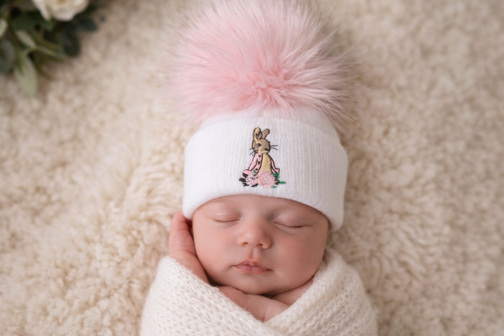 Cute baby girls flopsy bunny faux fur single pink pom hat