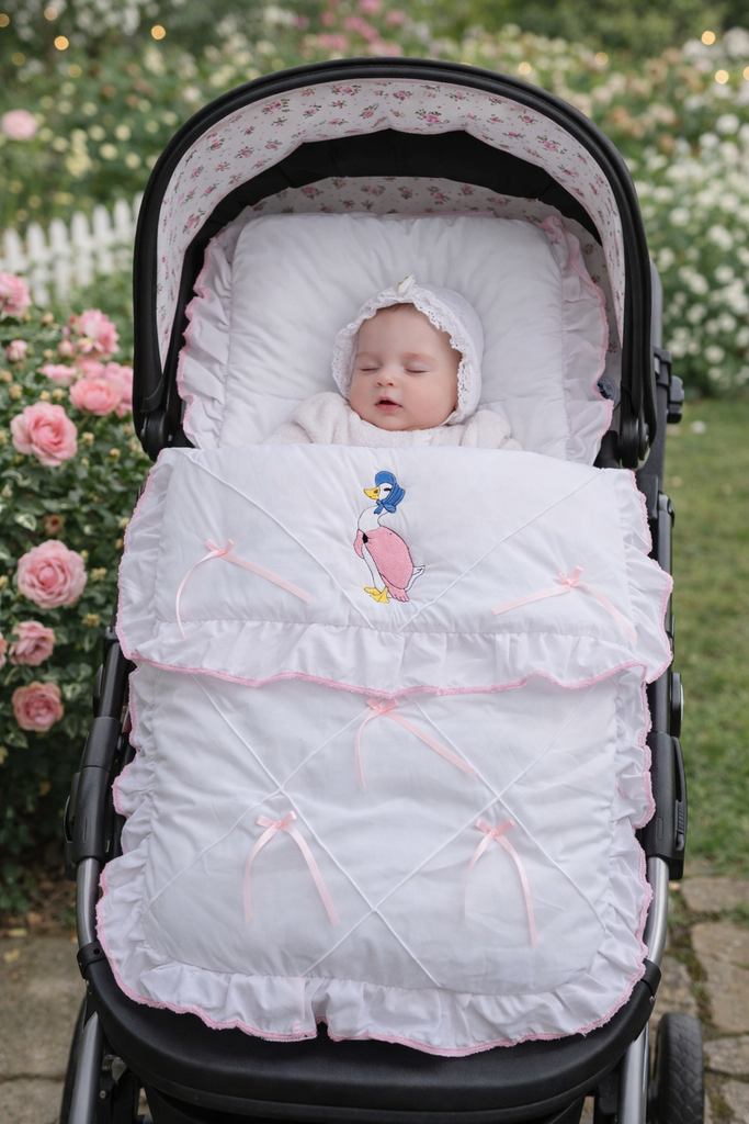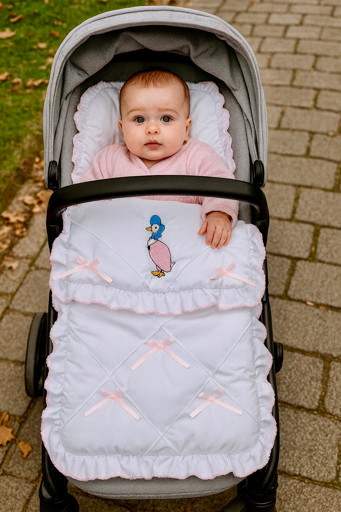 Beautiful baby girls Jemima puddleduck pram blanket cosy toes/footmuff