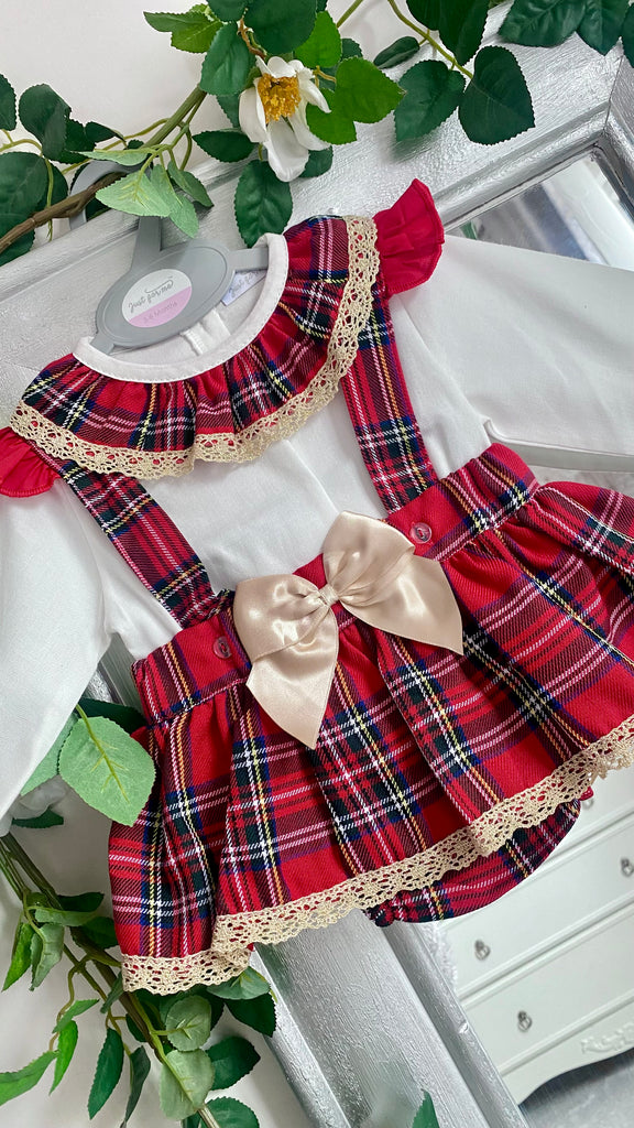 Adorable baby girls tartan romper set with pretty gold bow to finish the perfect look